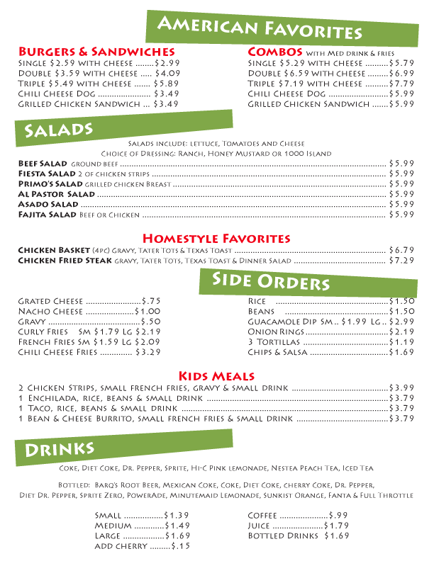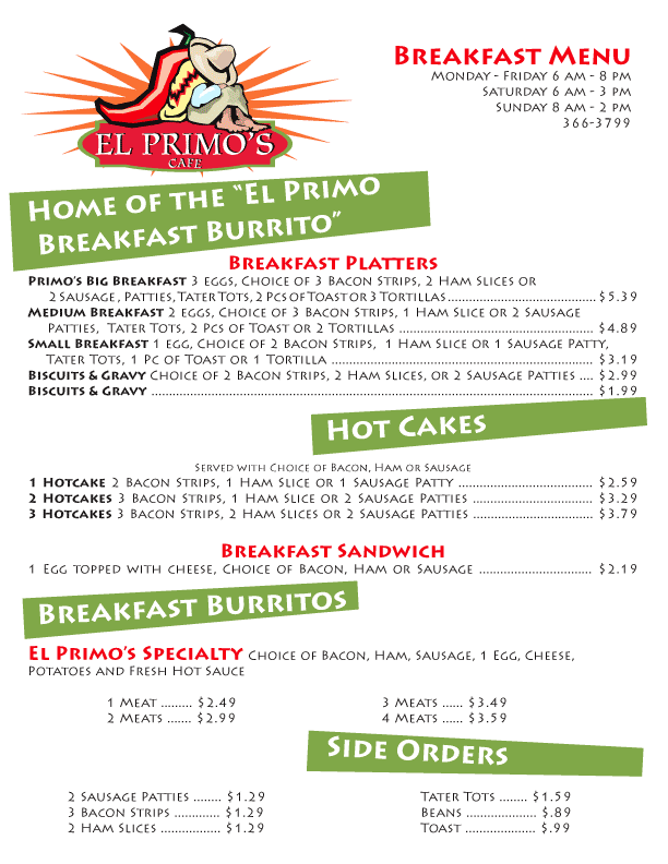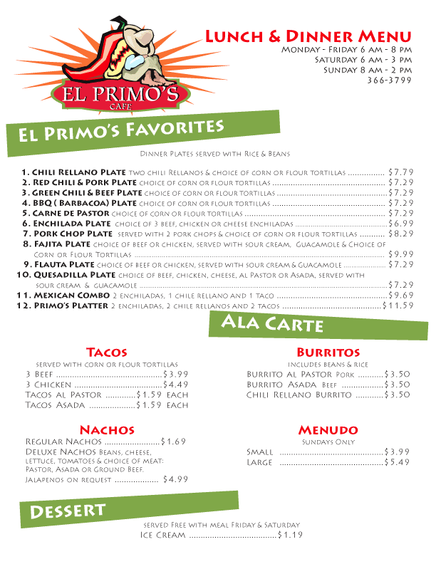 Primo's Cafe 514 E. Texas Stratford, Texas 79084 806-366-3799